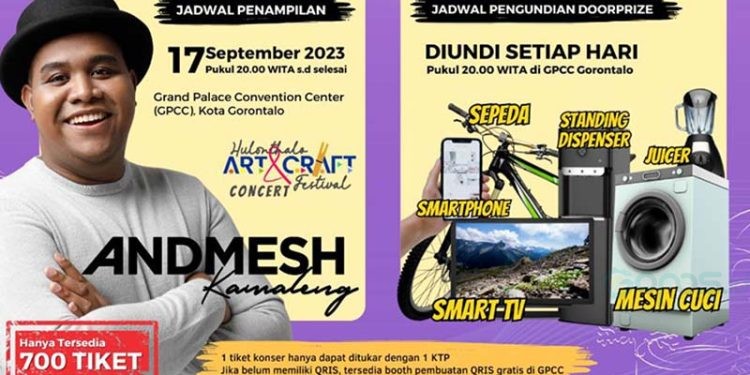Untuk menyaksikan penampilan Andmesh di Hulonthalo Art and Craft Festival 2023 sangat mudah. Cukup dengan berbelanja produk UMKM/kuliner/ngopi yang ada di Hulonthalo Art and Craf Festival 2023 senilai Rp100 ribu menggunakan QRIS. Bagi yang belum memiliki QRIS, tak usah khawatir. Di lokasi Hulonthalo Art and Craft Festival tersedia booth pembuatan QRIS gratis.
