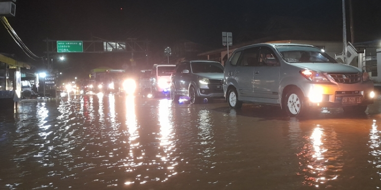 Banjir dengan ketinggian 40-70 centimeter ukuran lutut orang dewasa, selain membuat antrian panjang juga menyebabkan puluhan rumah terendam.