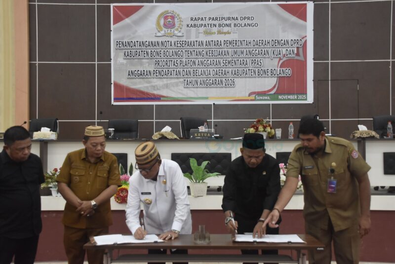GOPOS.ID, BONE BOLANGO – Pemerintah Kabupaten Bone Bolango bersama Dewan Perwakilan Rakyat Daerah (DPRD) resmi menandatangani Nota Kesepakatan Kebijakan Umum Anggaran dan Prioritas Plafon Anggaran Sementara (KUA-PPAS) Tahun Anggaran 2026. Penandatanganan ini berlangsung dalam Sidang Paripurna DPRD Bone Bolango di Ruang Sidang Utama, Senin (3/11/2025).