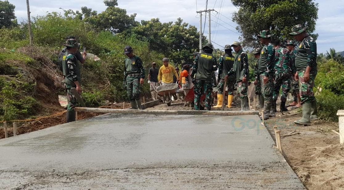 Gotong royong tanpa batas. Warga dan prajurit TMMD ke-126 bahu-membahu menuntaskan rabat beton yang menjadi urat nadi ekonomi desa.(foto.isno gopos)