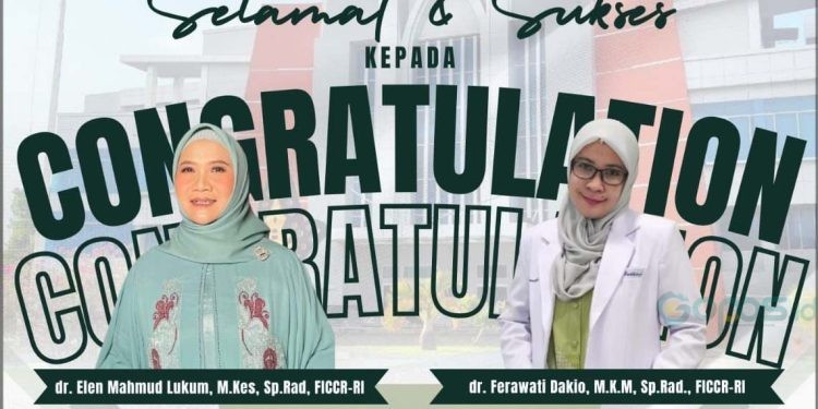 Kedua tenaga pendidik dokter tersebut yakni dr. Elen Mahmud Lukum, M.Kes., Sp.Rad, FICCR-RI yang baru saja menyelesaikan pendidikan subspesialis radiologi diagnostik, serta dr. Ferawati Dakio, MKM, Sp.Rad., FICC-RI yang menyelesaikan pendidikan subspesialis radiologi intervensional.