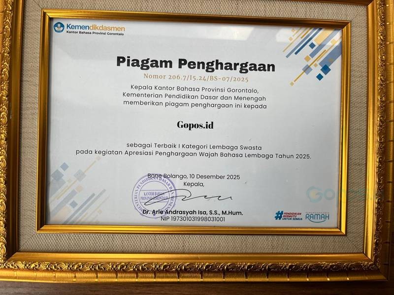 GOPOS.ID, GORONTALO – Media online Gopos.id berhasil meraih penghargaan terbaik I pada kegiatan Apresiasi Penghargaan Wajah Bahasa Lembaga Tahun 2025 kategori Instansi Swasta yang diselenggarakan oleh Kantor Bahasa Provinsi Gorontalo. Penghargaan tersebut diserahkan pada Kamis, 11 Desember 2025 bertempat di Kantor Bahasa Provinsi Gorontalo.