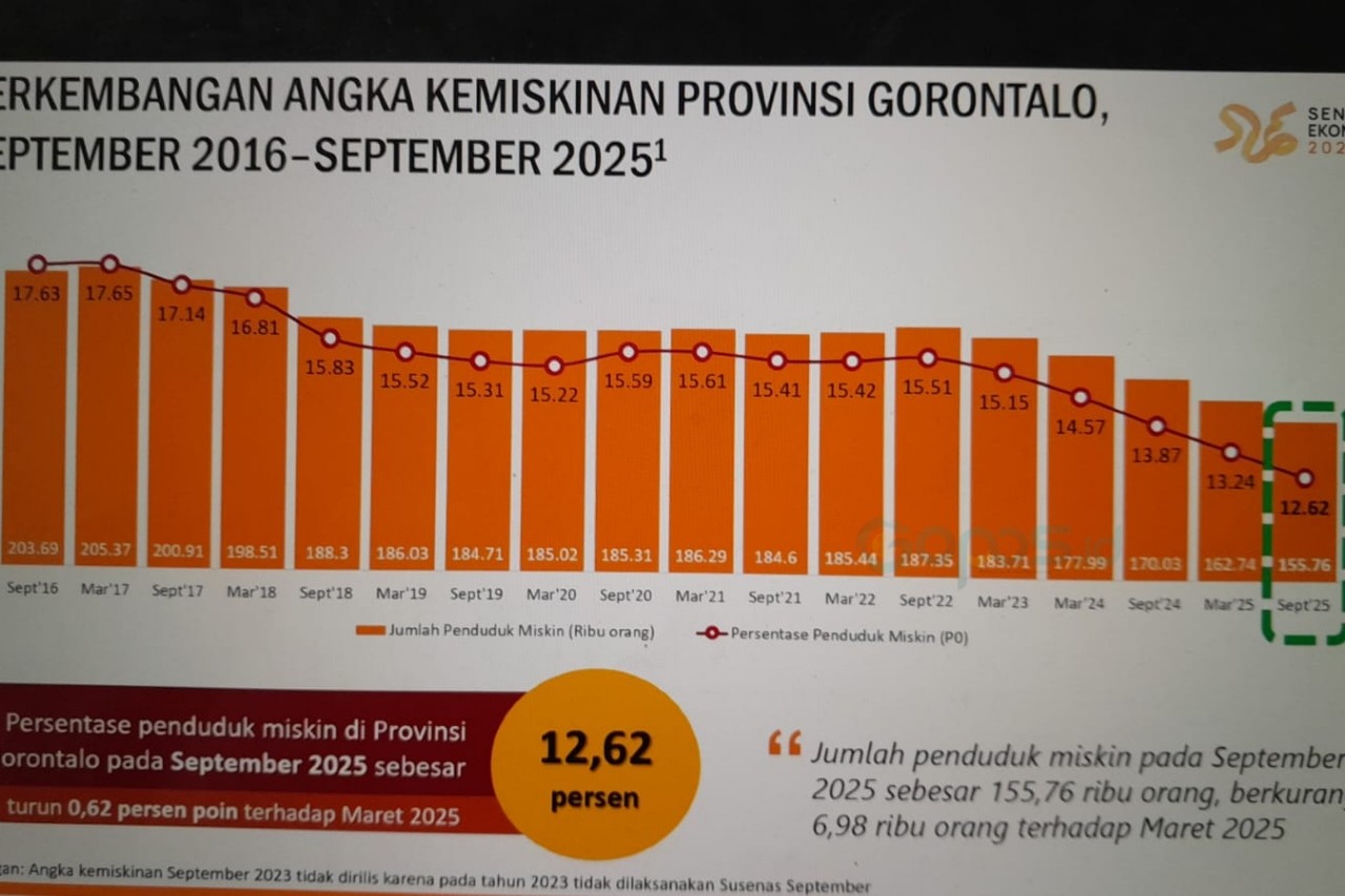 Data menunjukkan bahwa jumlah penduduk miskin di Gorontalo pada bulan September 2025 tercatat sebanyak 155,76 ribu orang, atau 12,62 persen dari total populasi. Angka ini menunjukkan penurunan sebesar 6,98 ribu orang dibandingkan dengan bulan Maret 2025 yang tercatat sebesar 162,74 ribu orang, atau penurunan 1,25 persen dari bulan September 2025.