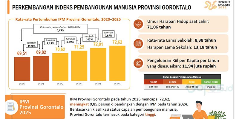 GOPOS.ID, GORONTALO – Indeks Pembangunan Manusia (IPM) Provinsi Gorontalo pada tahun 2025 tercatat sebesar 72,62, meningkat 0,85 persen dibandingkan tahun sebelumnya. Capaian ini menempatkan Gorontalo dalam kategori “tinggi” berdasarkan klasifikasi status pembangunan manusia, yang mencakup rentang nilai IPM antara 70 hingga 80.