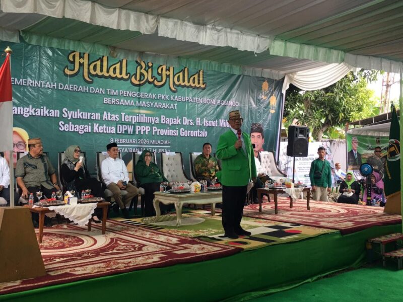 GOPOS.ID, BONE BOLANGO – Bupati Bone Bolango, Ismet Mile, resmi menahkodai DPW Partai Persatuan Pembangunan (PPP) Provinsi Gorontalo. Kepastian itu disampaikannya saat menggelar halal bihalal Pemerintah Daerah bersama TP-PKK yang dihadiri ribuan masyarakat dan dirangkaikan dengan syukuran di kediaman pribadinya, Minggu (8/2/2026).