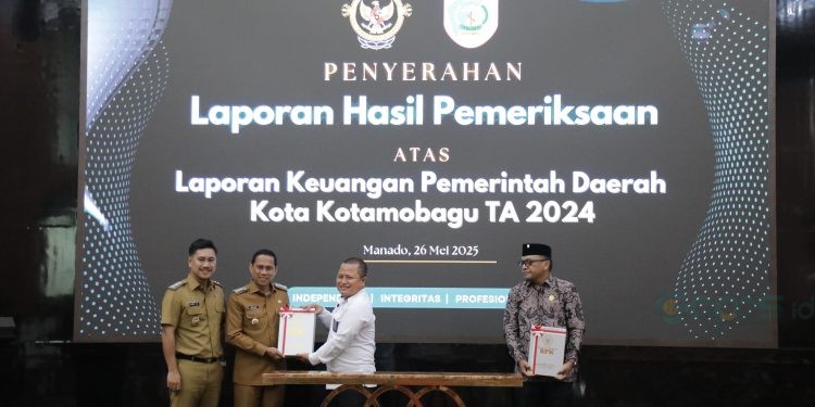 LHP diserahkan langsung oleh Kepala BPK RI Perwakilan Sulut, Bombit Agus Mulyo, S.E., M.M., Ak., CA., CSFA., ERMAP., GRCP., GRCA., kepada Wali Kota Kotamobagu dr. Weny Gaib, Sp.M, didampingi Wakil Wali Kota Rendy Virgiawan Mangkat, S.H., M.H., serta Ketua DPRD Kotamobagu, Adrianus Mokoginta, S.E.