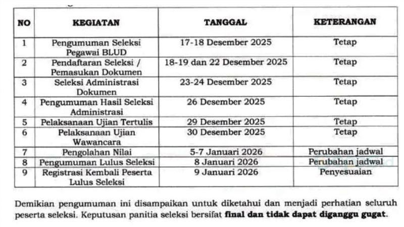 Panitia memastikan peserta pada formasi dokter tetap akan menerima pengumuman kelulusan sesuai jadwal semula, yakni pada 2 Januari 2026.