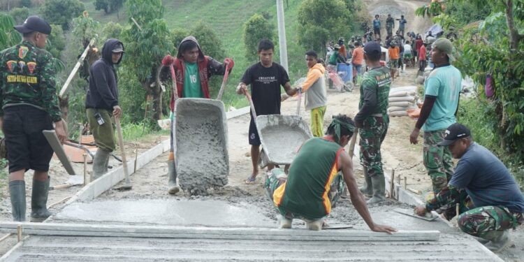Sebanyak 46 persen pekerjaan jalan rabat beton di Desa Tonala telah rampung, menandai semangat gotong royong antara prajurit TNI dan masyarakat sete, Kamis (23/10/2025).