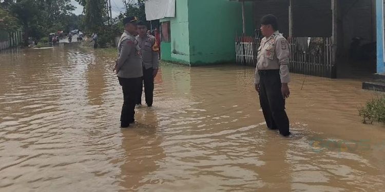 Para personel dipimpin langsung Kapolsek Marisa, IPTU M. Harry Satya Wira Dharma, bersama KBO Samapta Polres Pohuwato, IPTU Efendi Isa langsung terjun ke lokasi buat monitoring kondisi banjir.