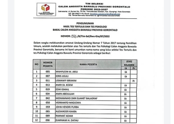 GOPOS.ID, GORONTALO – Sebanyak 12 calon Anggota Badan Pengawas Pemilu (Bawaslu) Provinsi Gorontalo dinyatakan lulus tes tertulis dan tes psikologi, ...